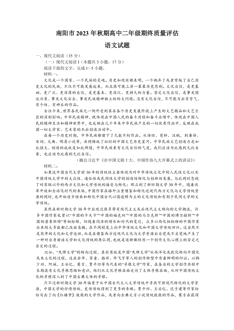 河南省南阳市2023-2024学年高二上学期期末考试语文+答案
