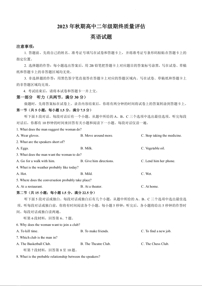河南省南阳市2023-2024学年高二上学期期末考试英语+答案