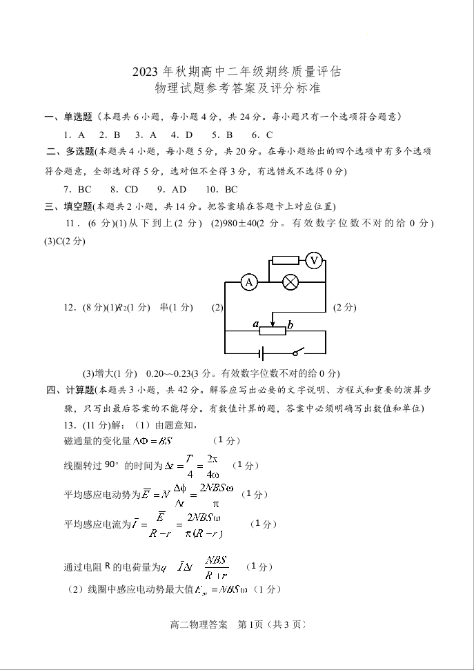 河南省南阳市2023-2024学年高二上学期期末考试物理答案