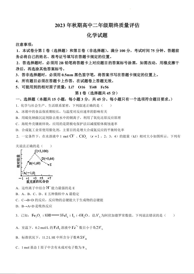 河南省南阳市2023-2024学年高二上学期期末考试化学+答案