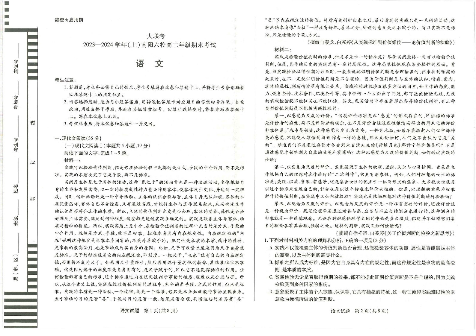 河南省南阳市六校2023-2024学年高二上学期1月期末考试语文