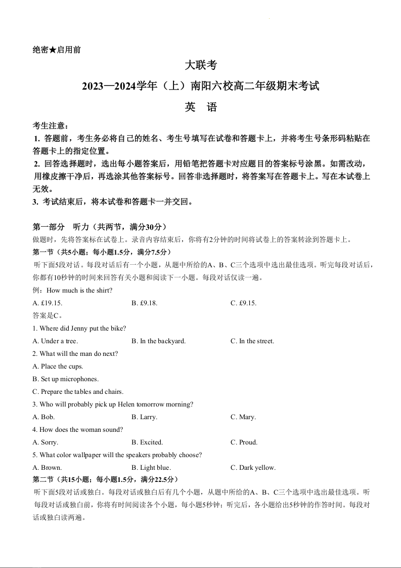 河南省南阳市六校2023-2024学年高二上学期1月期末考试英语+答案