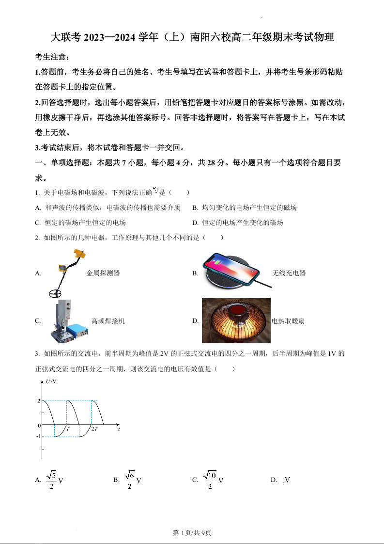 河南省南阳市六校2023-2024学年高二上学期1月期末考试物理+答案