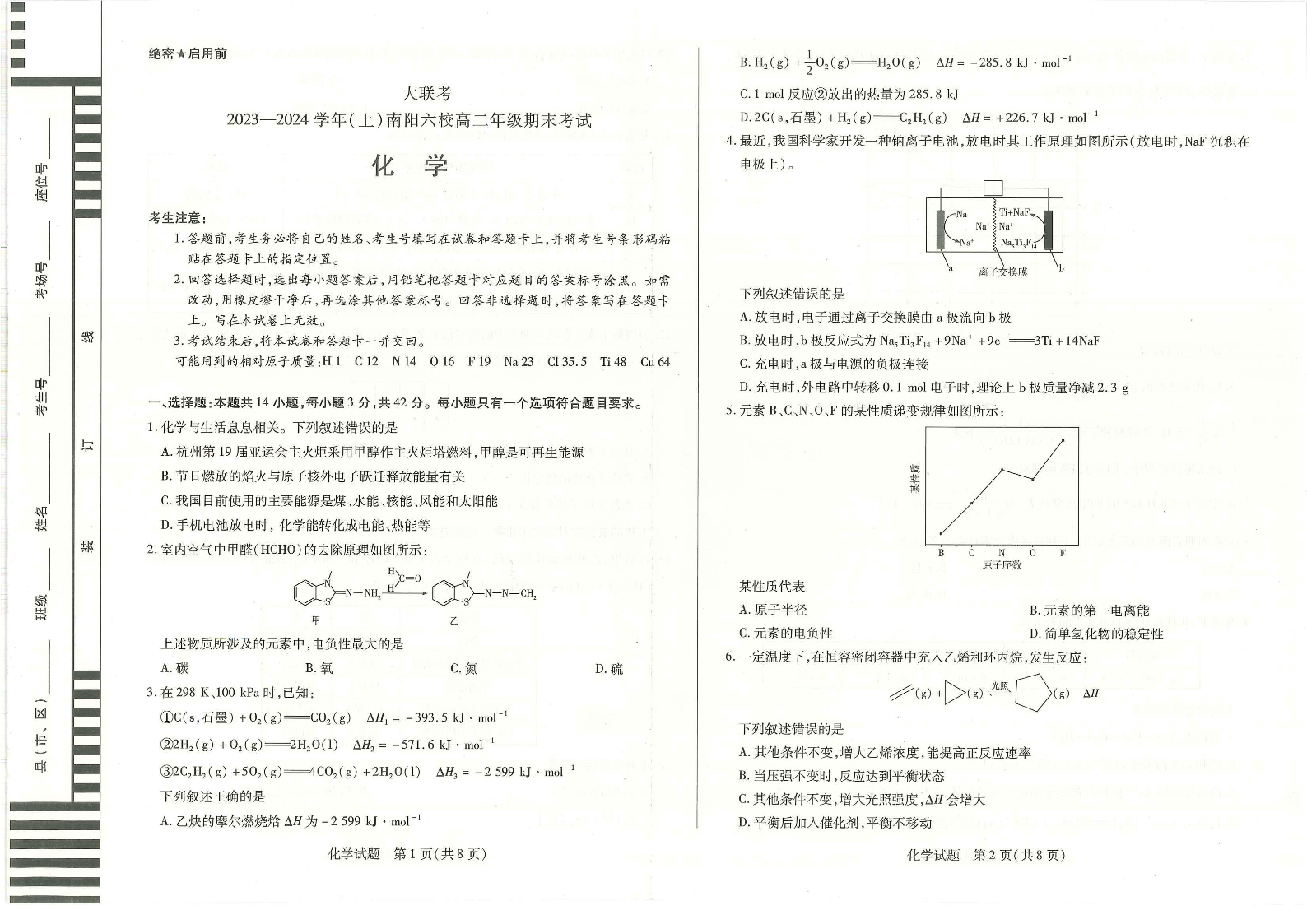河南省南阳市六校2023-2024学年高二上学期1月期末考试化学