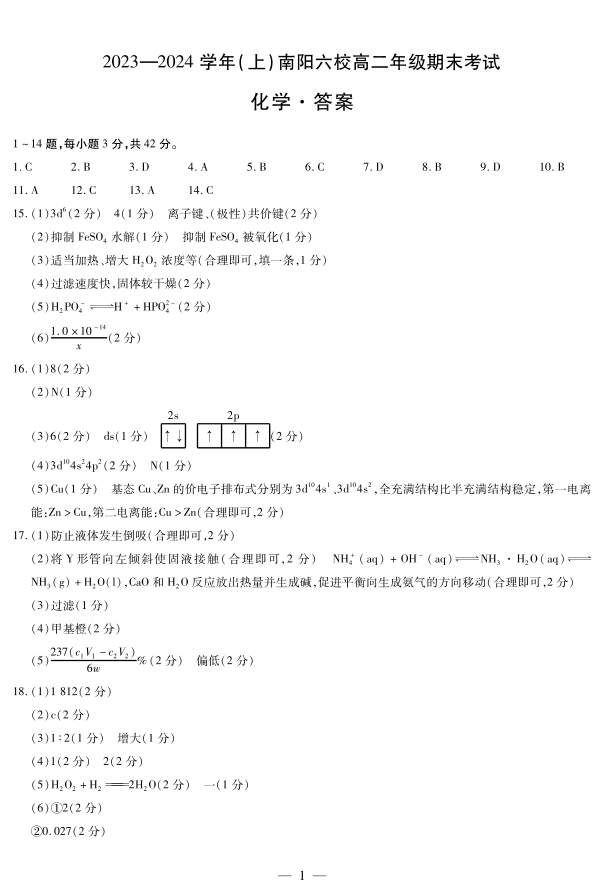 河南省南阳市六校2023-2024学年高二上学期1月期末考试化学答案