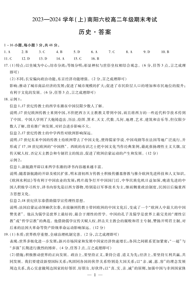 河南省南阳市六校2023-2024学年高二上学期1月期末考试历史答案