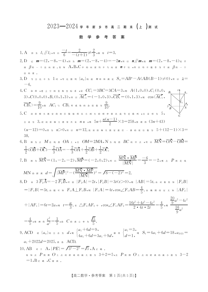河南省新乡市2023-2024学年高二上学期1月期末测试数学答案