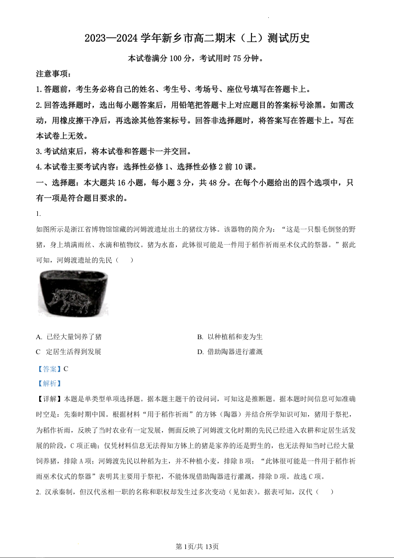 河南省新乡市2023-2024学年高二上学期1月期末测试历史(精品解析版)