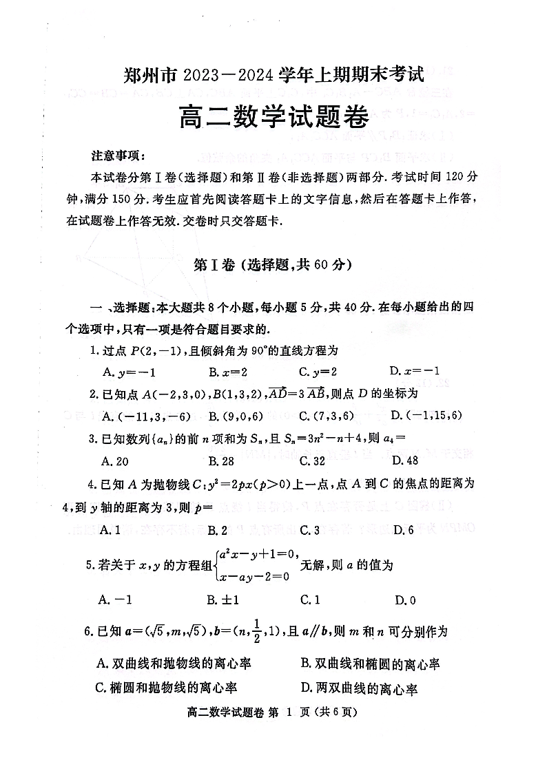 河南省郑州市2023-2024学年高二上学期期末考试数学