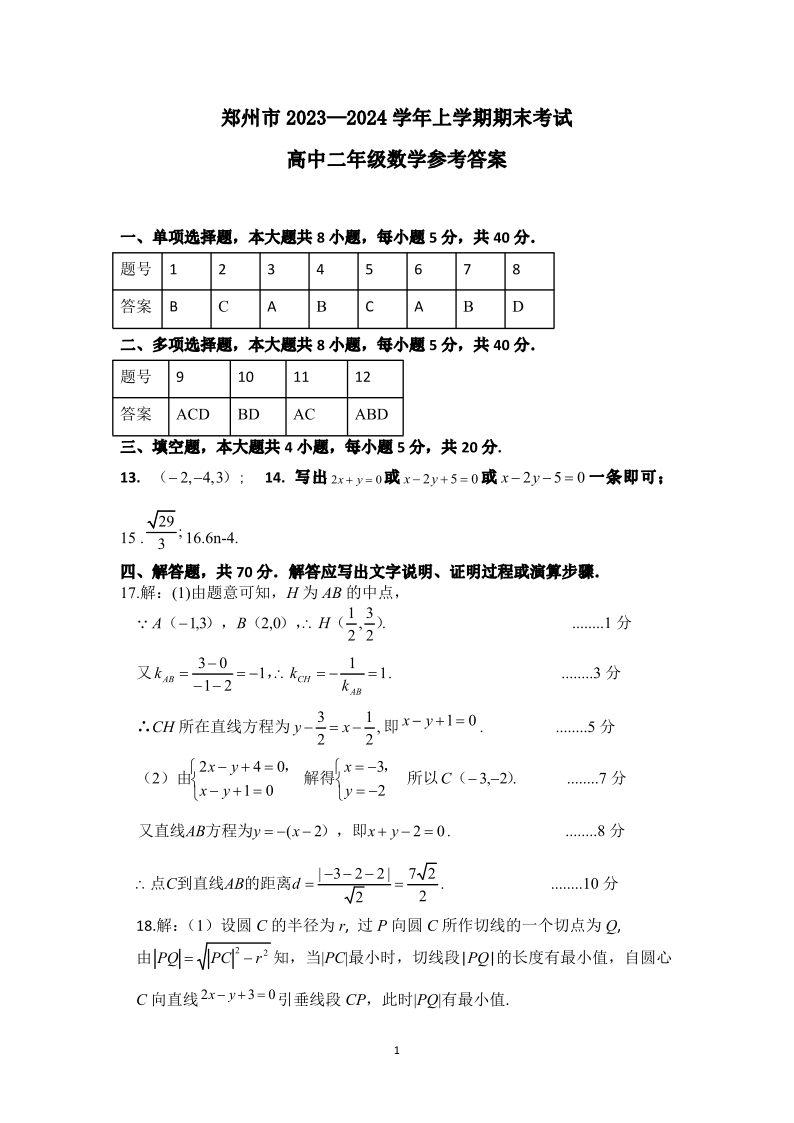 河南省郑州市2023-2024学年高二上学期期末考试数学答案