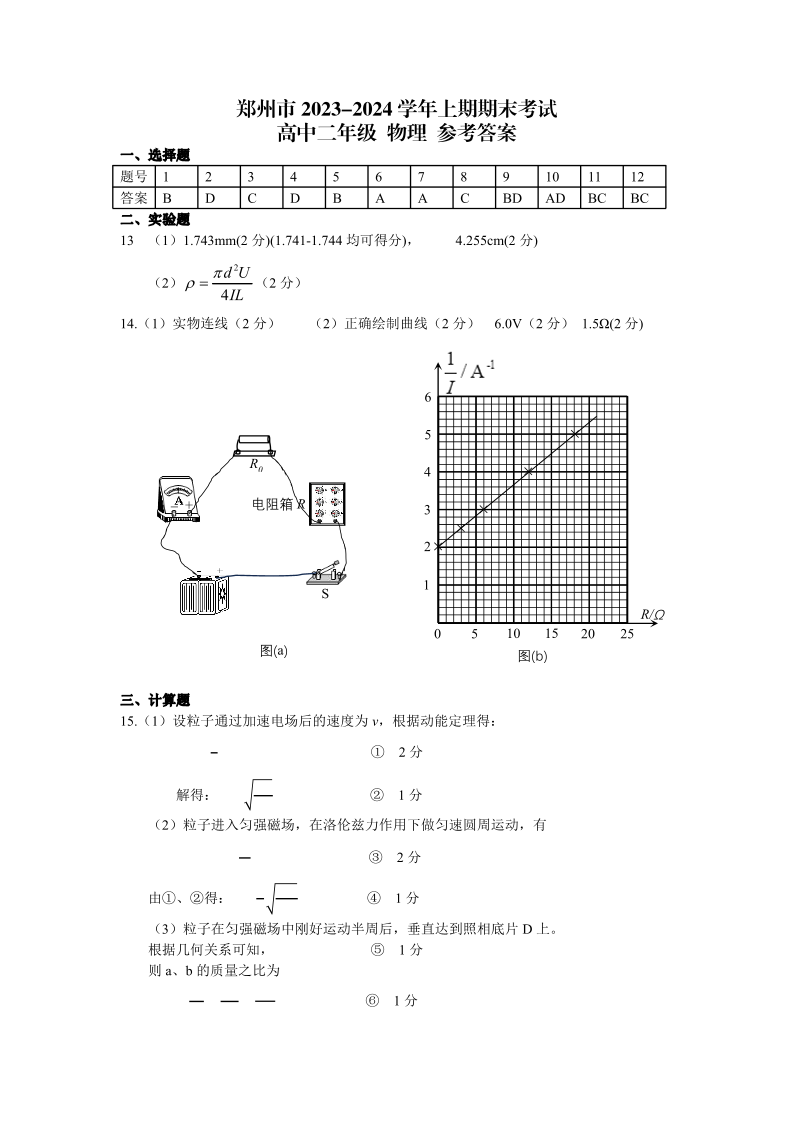 河南省郑州市2023-2024学年高二上学期期末考试物理答案