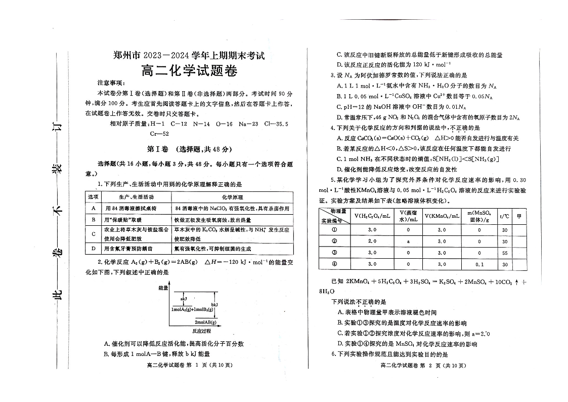 河南省郑州市2023-2024学年高二上学期期末考试化学