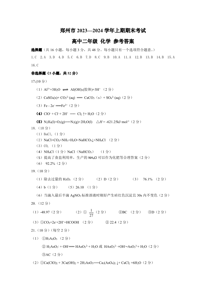 河南省郑州市2023-2024学年高二上学期期末考试化学答案