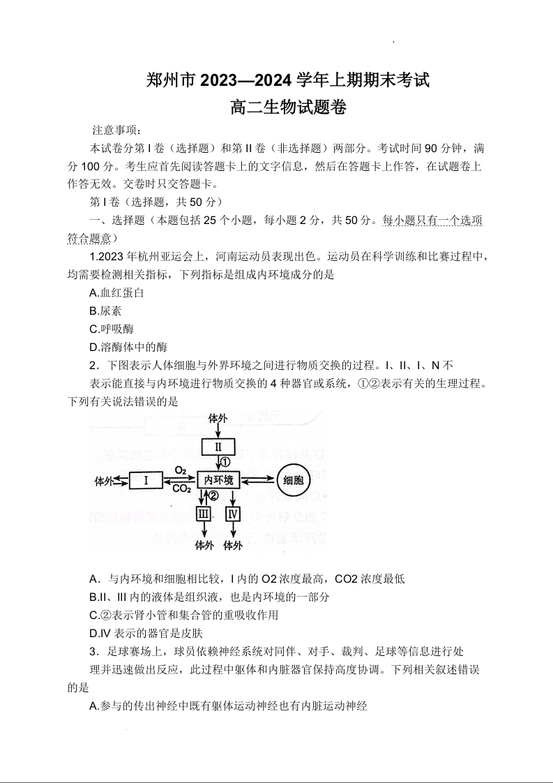 河南省郑州市2023-2024学年高二上学期期末考试生物