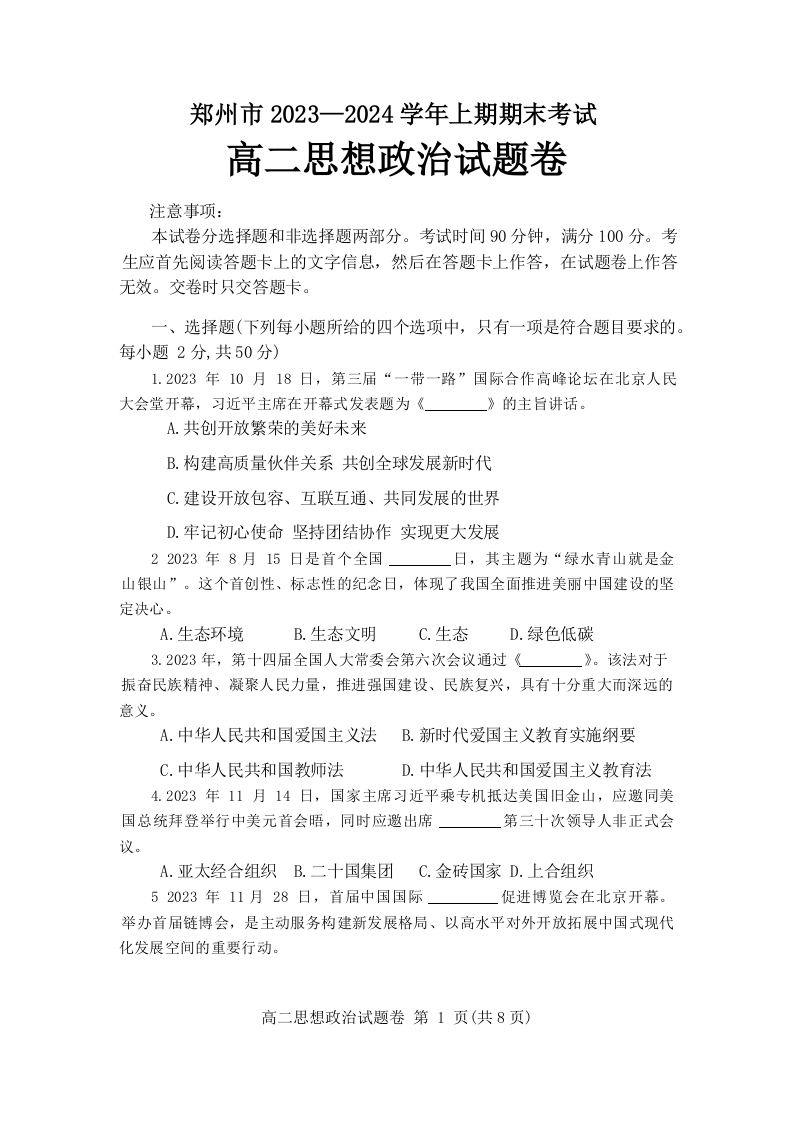河南省郑州市2023-2024学年高二上学期期末考试政治