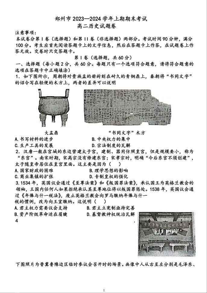 河南省郑州市2023-2024学年高二上学期期末考试历史+答案