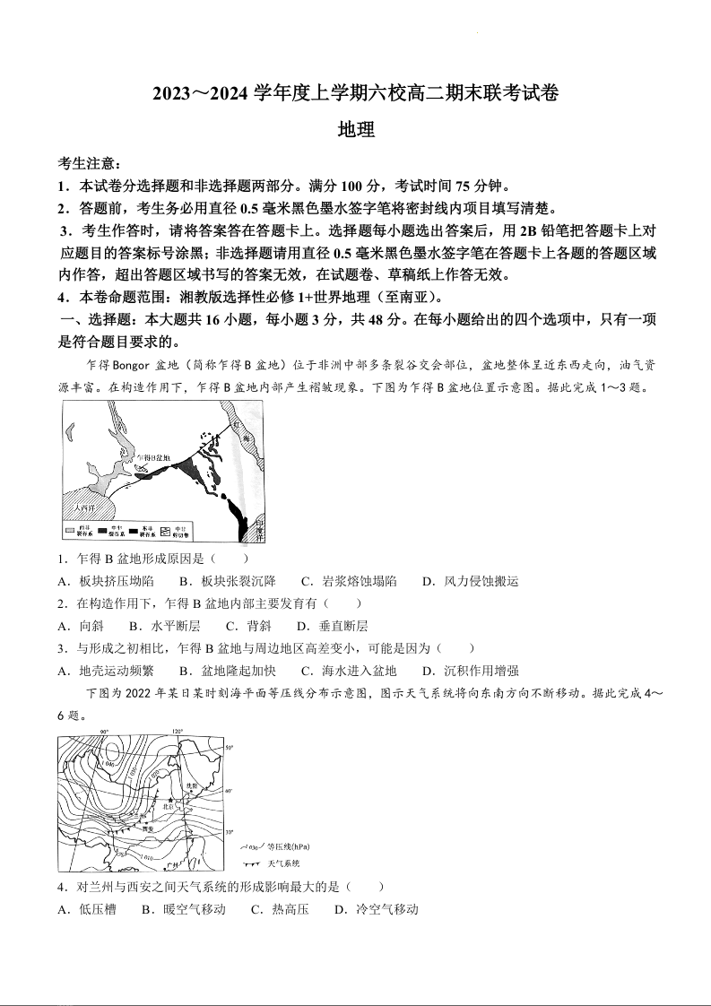黑龙江省哈尔滨市2023~2024学年度上学期六校高二期末联考地理