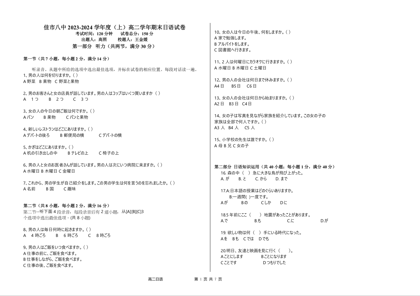 黑龙江省佳木斯市三校联考2023-2024学年上学期期末考试日语