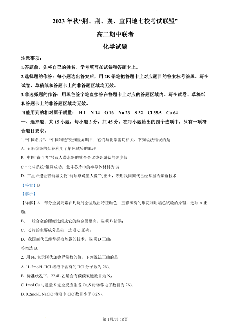 湖北省23年秋”荆荆襄宜四地七校考试联盟“高二期中联考化学(精品解析版)