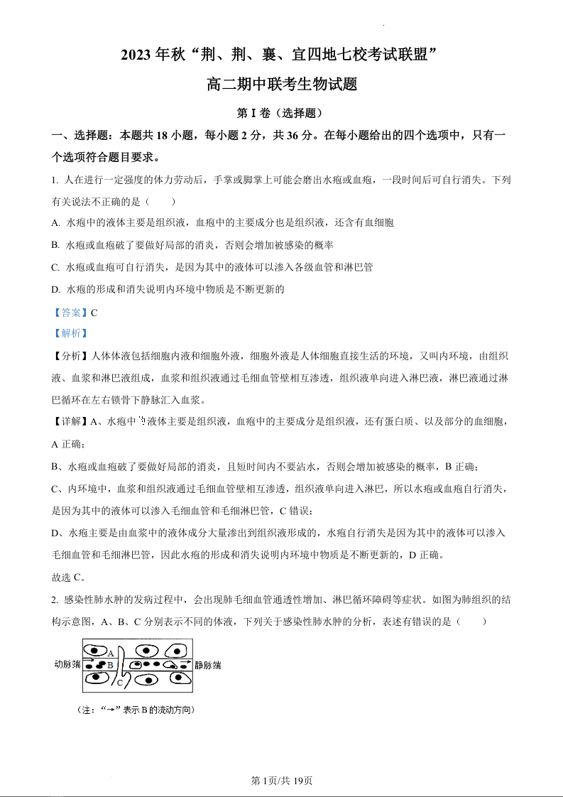 湖北省23年秋”荆荆襄宜四地七校考试联盟“高二期中联考生物(精品解析版)