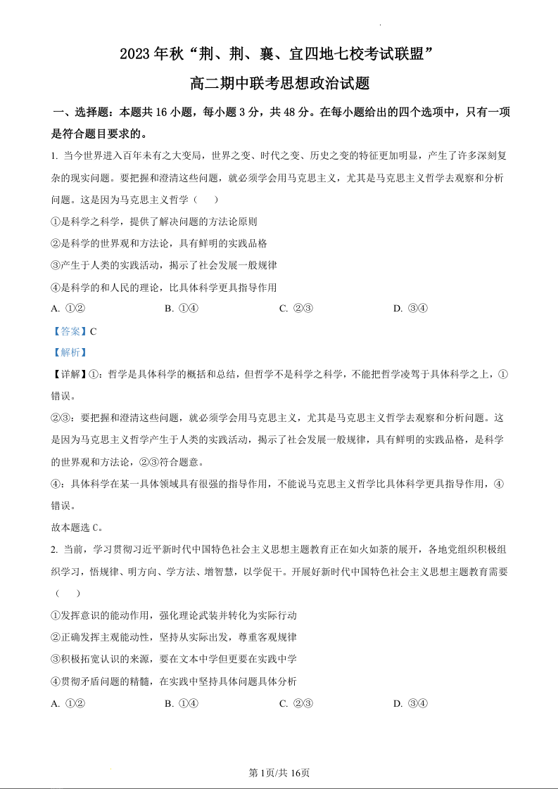 湖北省23年秋”荆荆襄宜四地七校考试联盟“高二期中联考政治(精品解析版)