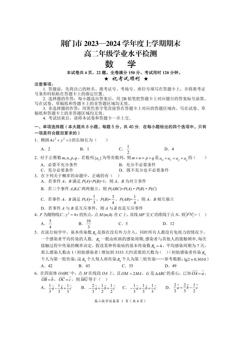 湖北省荆门市2023-2024学年度上学期期末高二年级学业水平检测数学