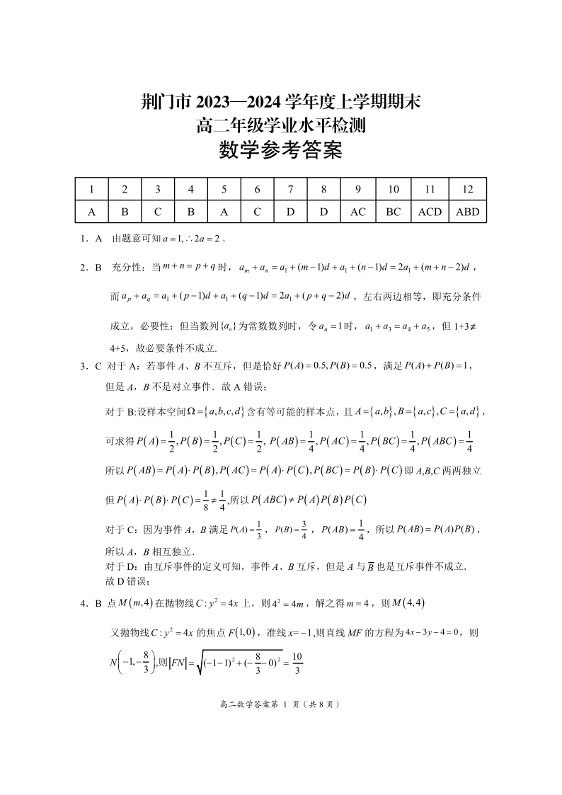 湖北省荆门市2023-2024学年度上学期期末高二年级学业水平检测数学答案