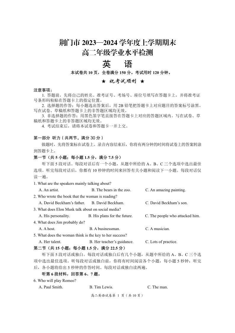 湖北省荆门市2023-2024学年度上学期期末高二年级学业水平检测英语