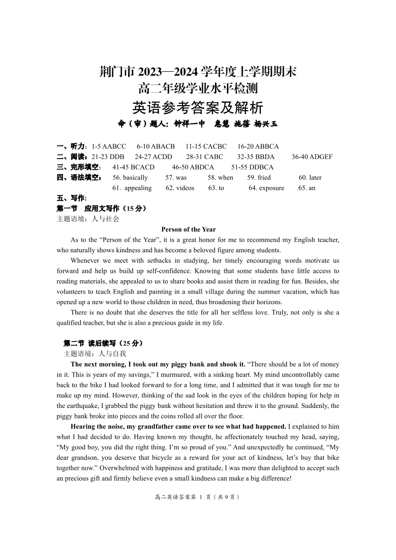 湖北省荆门市2023-2024学年度上学期期末高二年级学业水平检测英语答案