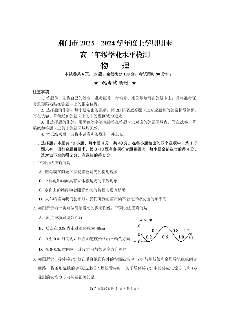 湖北省荆门市2023-2024学年度上学期期末高二年级学业水平检测物理