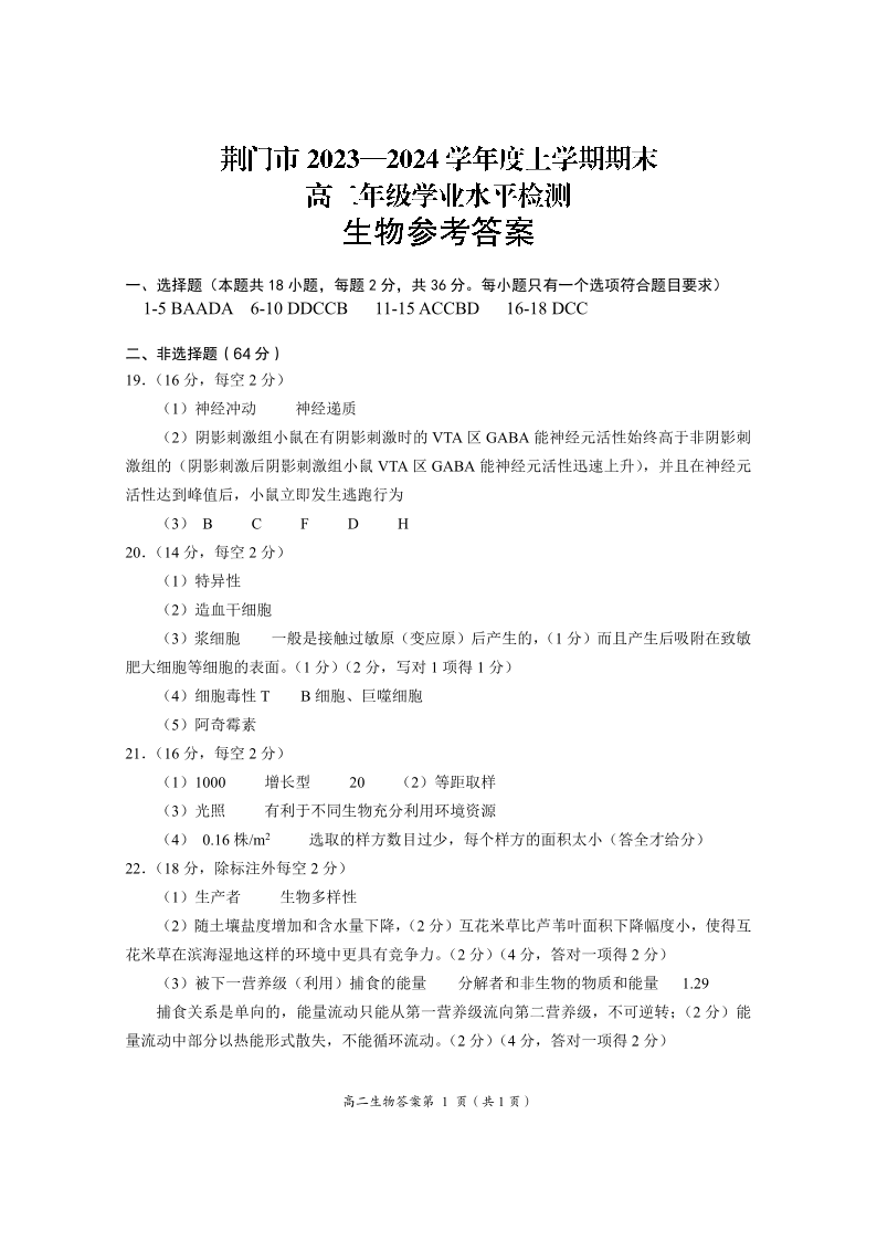 湖北省荆门市2023-2024学年度上学期期末高二年级学业水平检测生物答案