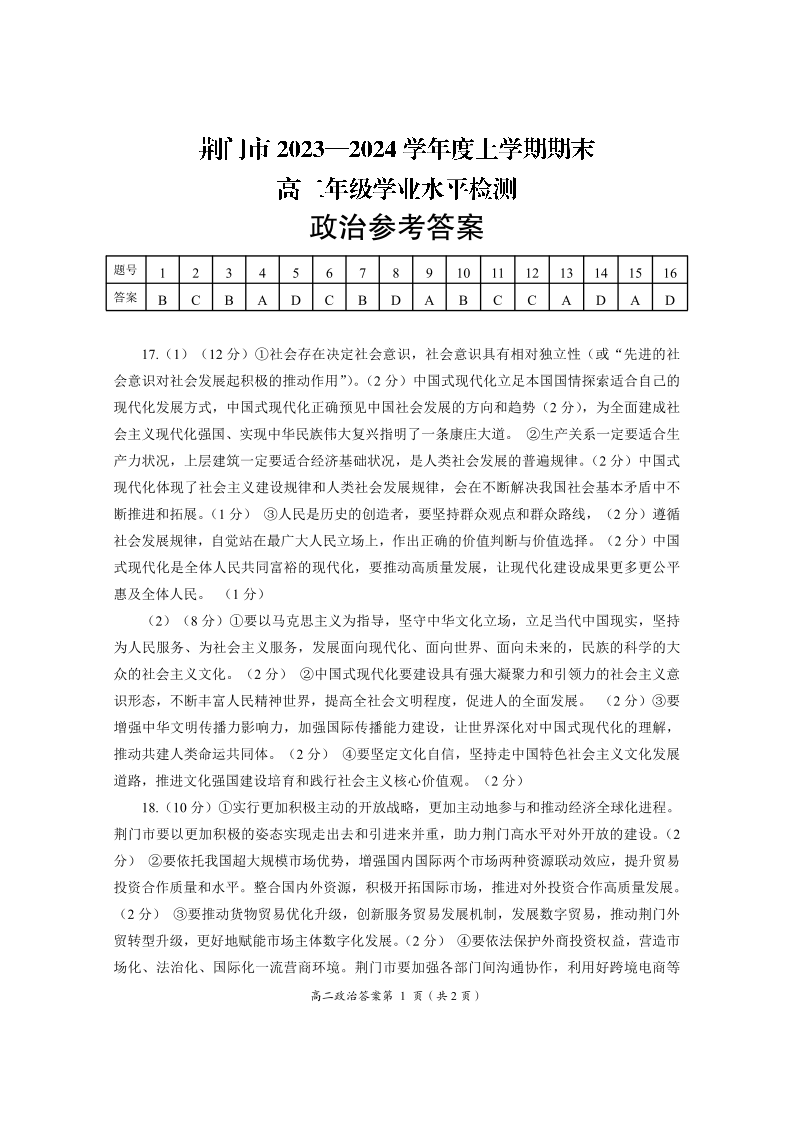 湖北省荆门市2023-2024学年度上学期期末高二年级学业水平检测政治答案