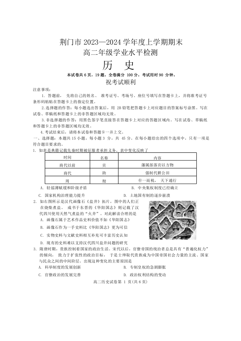 湖北省荆门市2023-2024学年度上学期期末高二年级学业水平检测历史