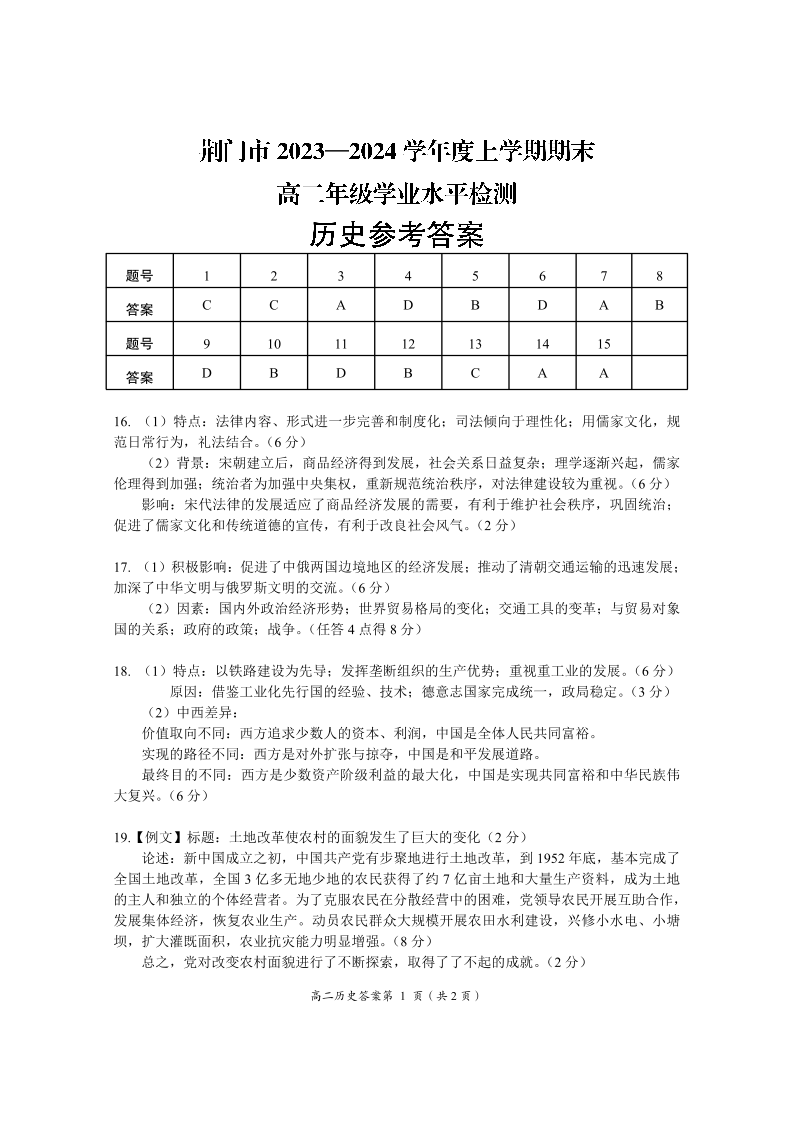 湖北省荆门市2023-2024学年度上学期期末高二年级学业水平检测历史答案