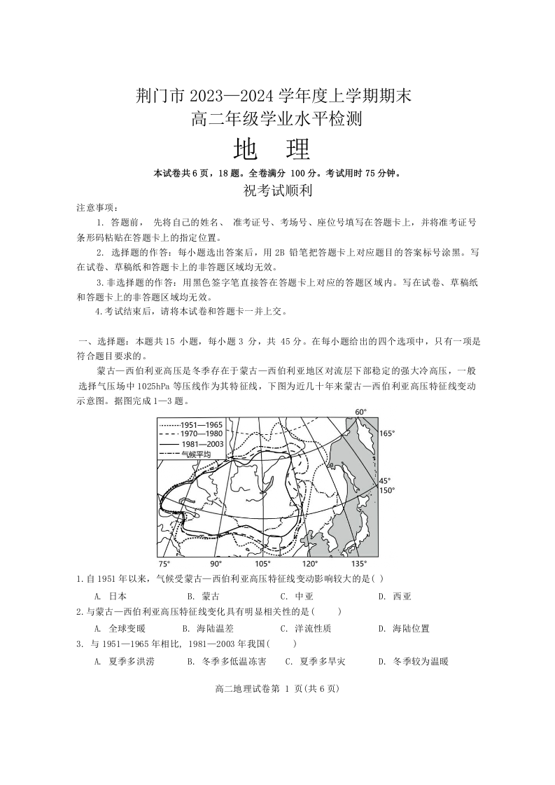 湖北省荆门市2023-2024学年度上学期期末高二年级学业水平检测地理