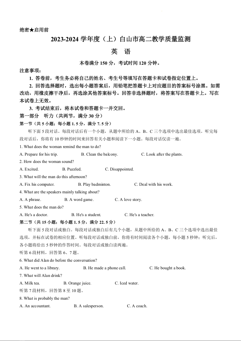 吉林省白山市2023-2024学年高二上学期教学质量监测英语+答案