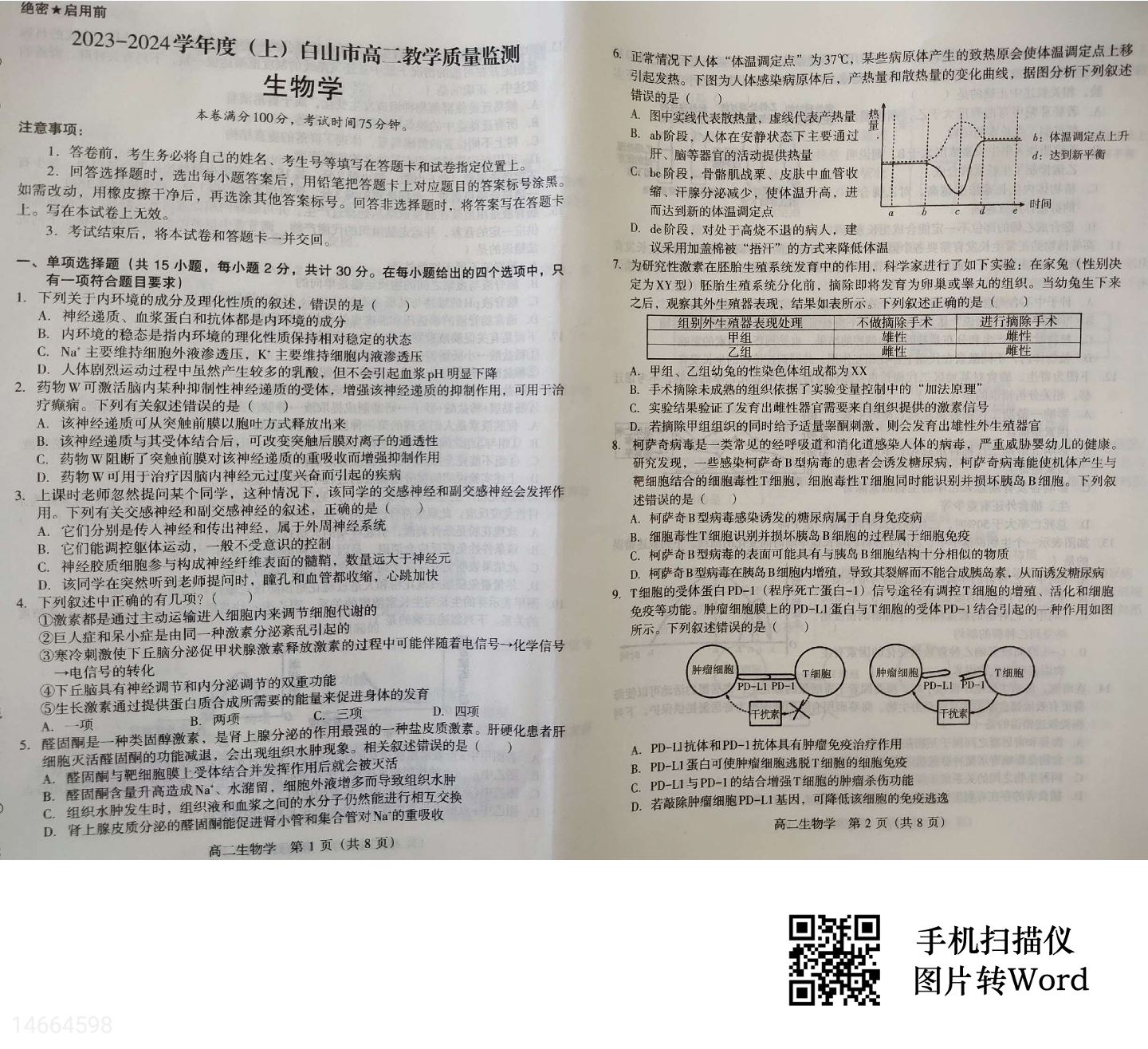 吉林省白山市2023-2024学年高二上学期教学质量监测生物+答案