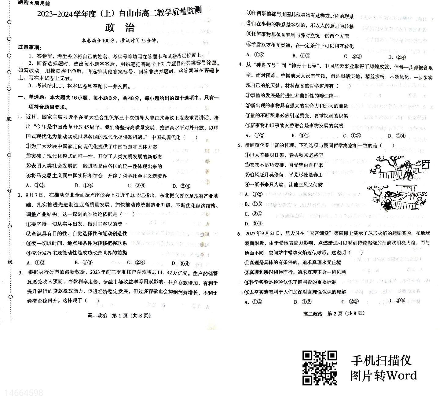 吉林省白山市2023-2024学年高二上学期教学质量监测政治+答案