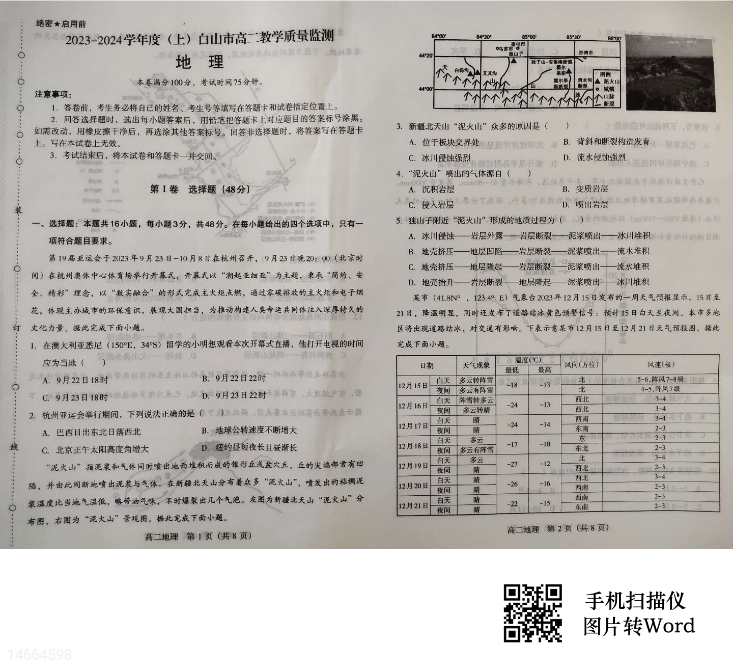 吉林省白山市2023-2024学年高二上学期教学质量监测地理+答案