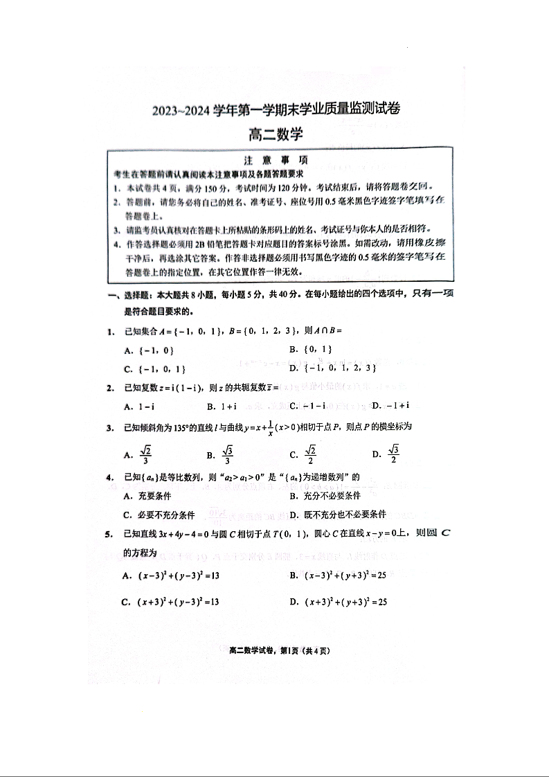 江苏省南通市海安市2023~2024学年第一学期末学业质量监测数学+答案