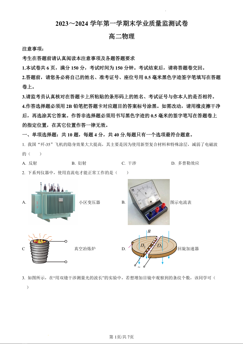 江苏省南通市海安市2023~2024学年第一学期末学业质量监测物理(原卷版)