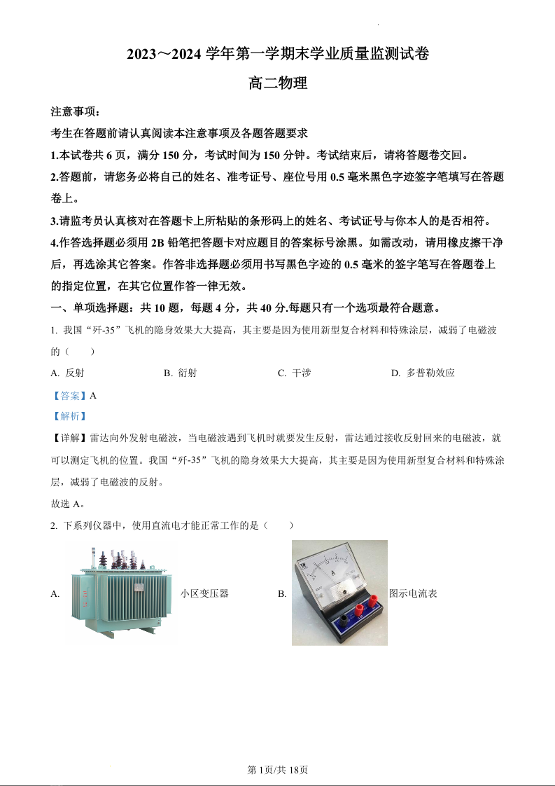 江苏省南通市海安市2023~2024学年第一学期末学业质量监测物理(精品解析版)