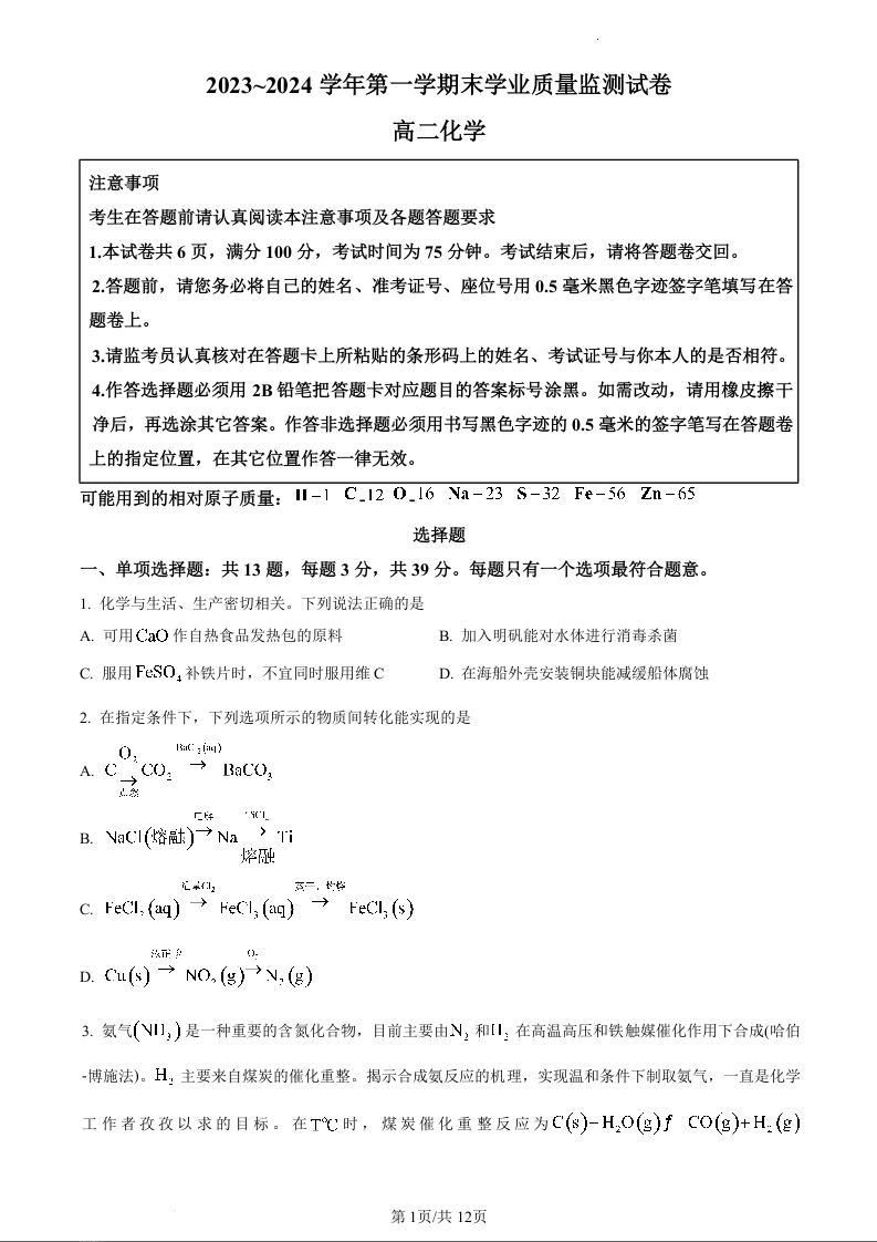 江苏省南通市海安市2023~2024学年第一学期末学业质量监测化学(原卷版)