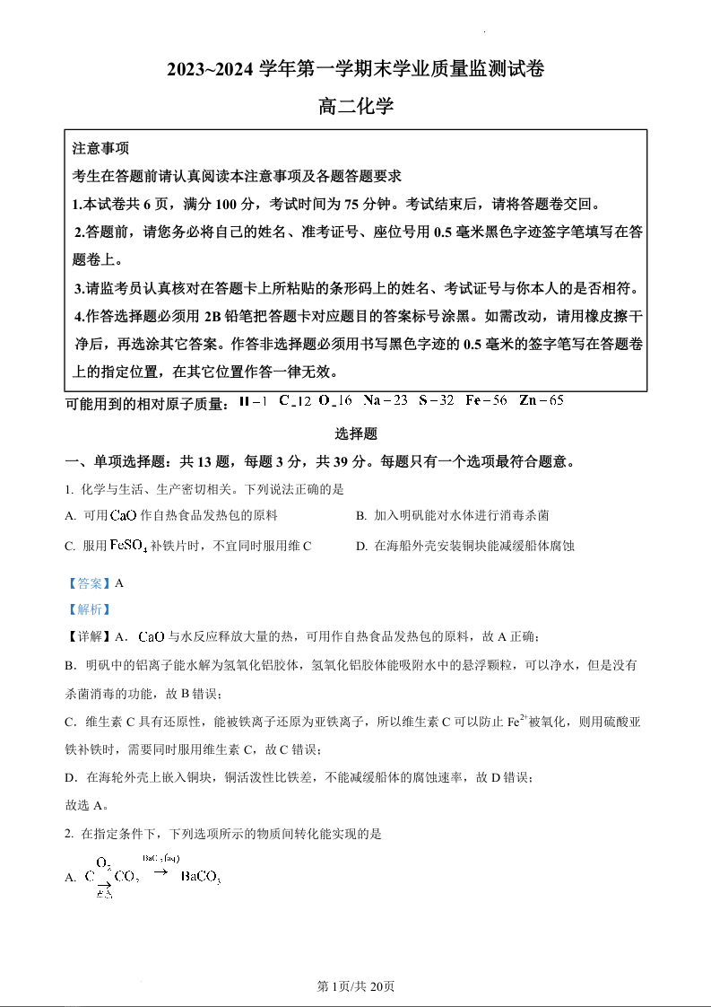 江苏省南通市海安市2023~2024学年第一学期末学业质量监测化学(精品解析版)