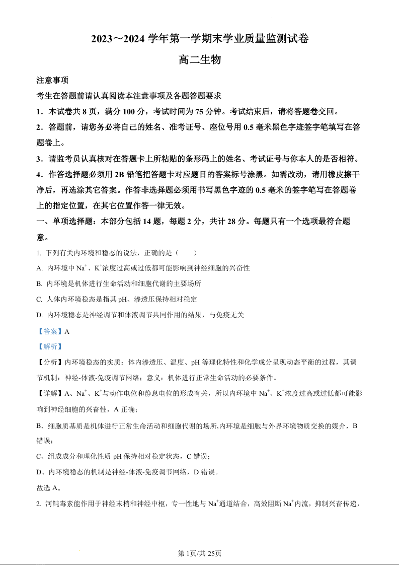 江苏省南通市海安市2023~2024学年第一学期末学业质量监测生物(精品解析版)