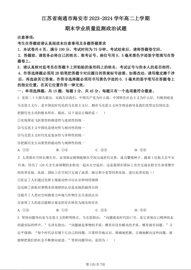 江苏省南通市海安市2023~2024学年第一学期末学业质量监测政治(原卷版)