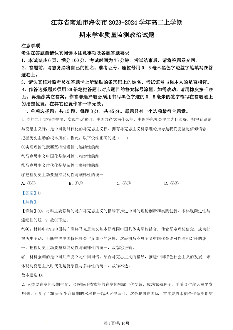 江苏省南通市海安市2023~2024学年第一学期末学业质量监测政治(精品解析版)