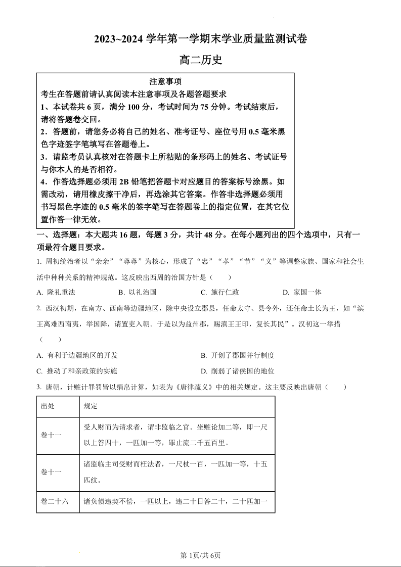 江苏省南通市海安市2023~2024学年第一学期末学业质量监测历史(原卷版)
