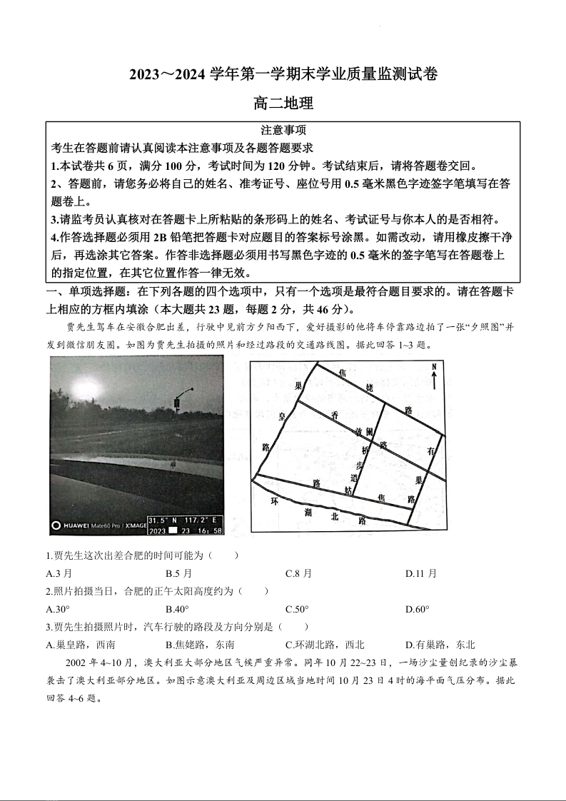 江苏省南通市海安市2023~2024学年第一学期末学业质量监测地理+答案
