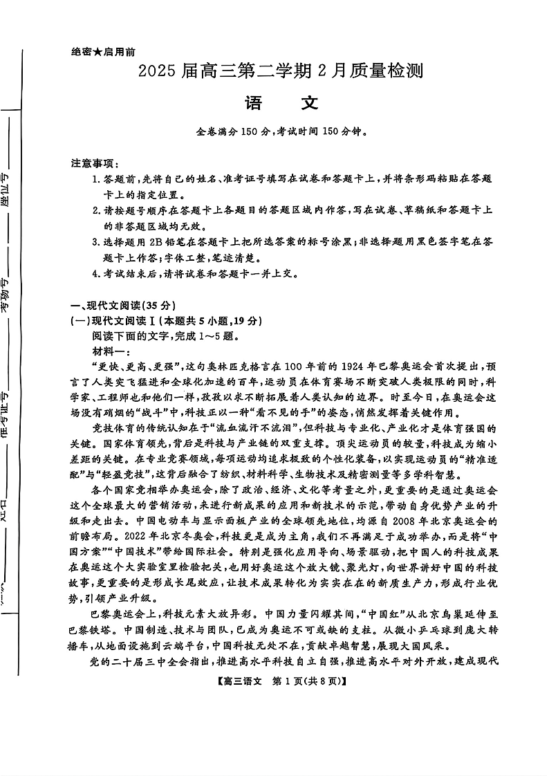 河南省金科大联考2024-2025学年下学期2月高三质量检测语文